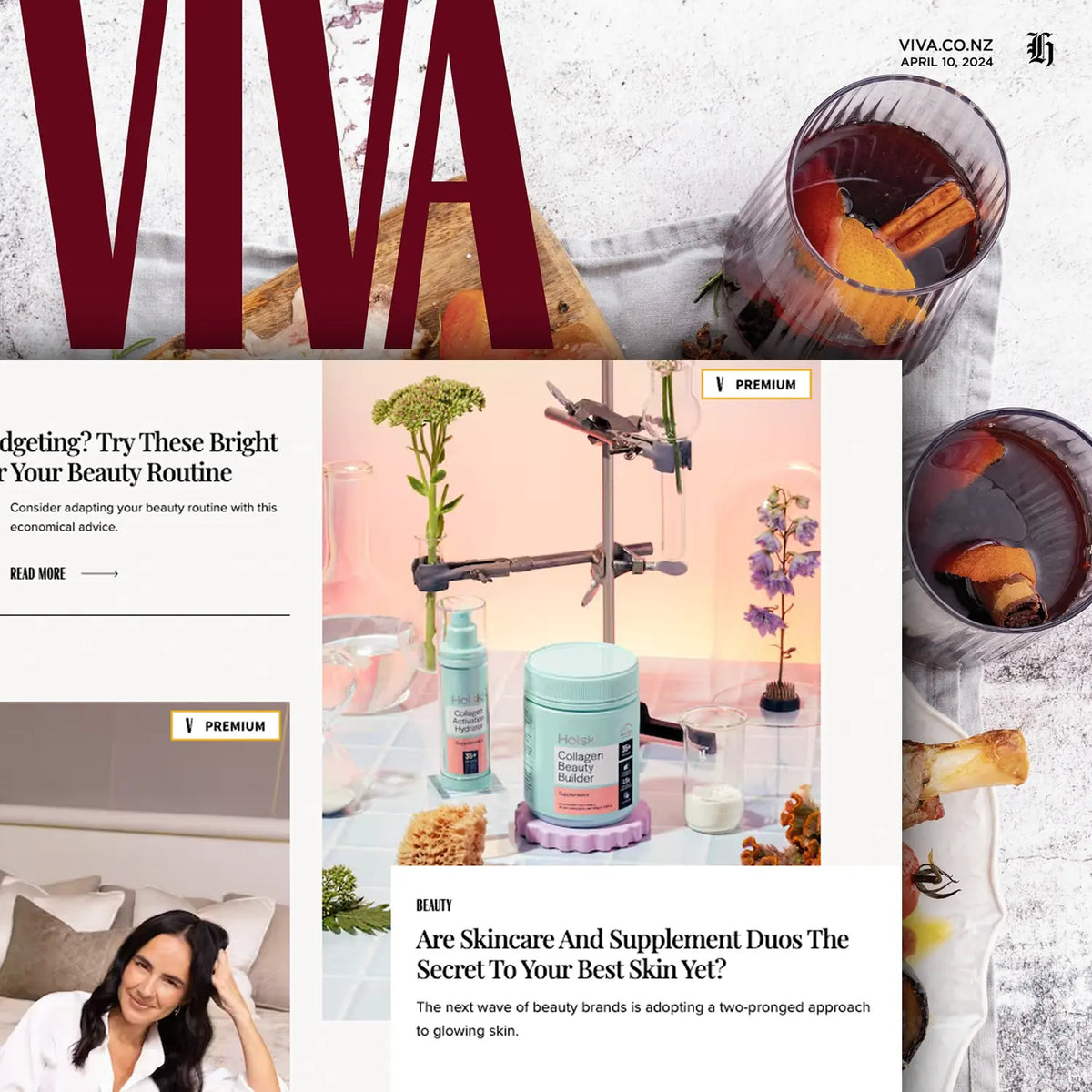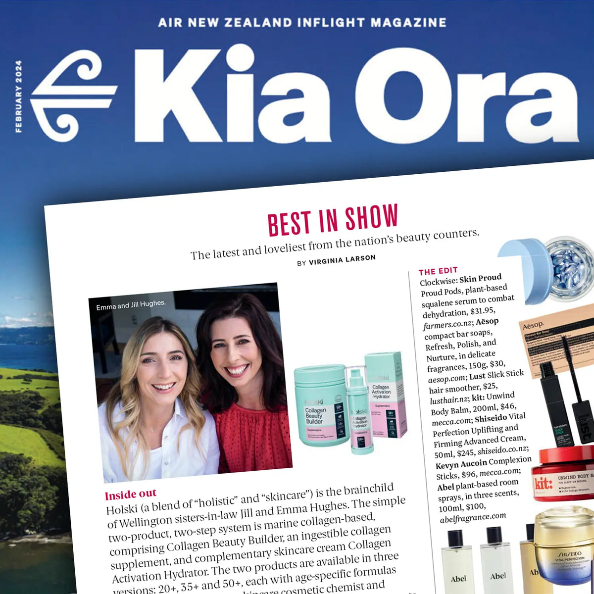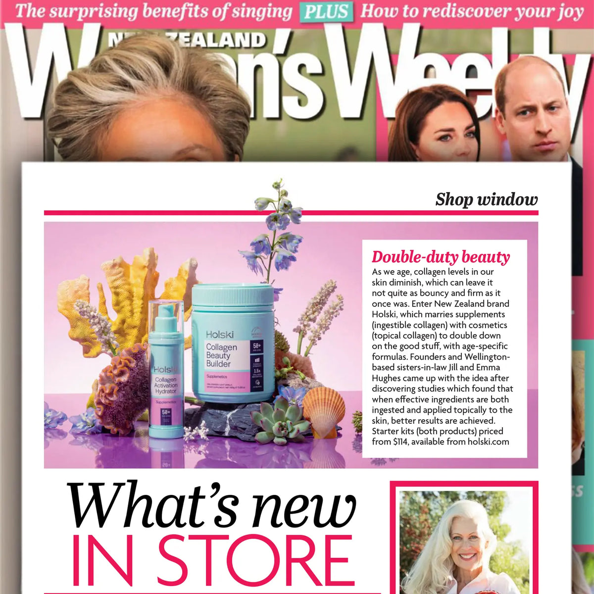 Double-Duty Beauty: As we age, collagen levels in our skin diminish, which can leave it not quite as bouncy and firm as it once was. Enter New Zealand brand Holski, which marries supplements (ingestible collagen) with cosmetics