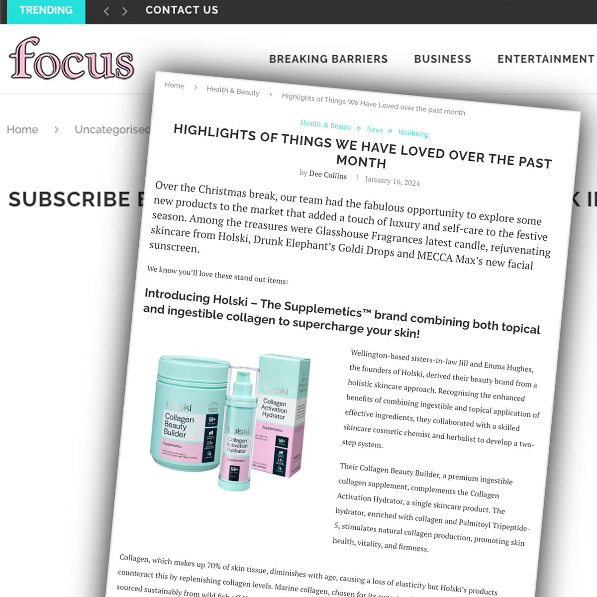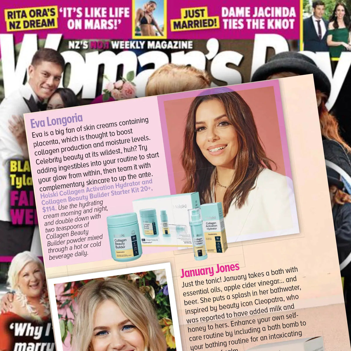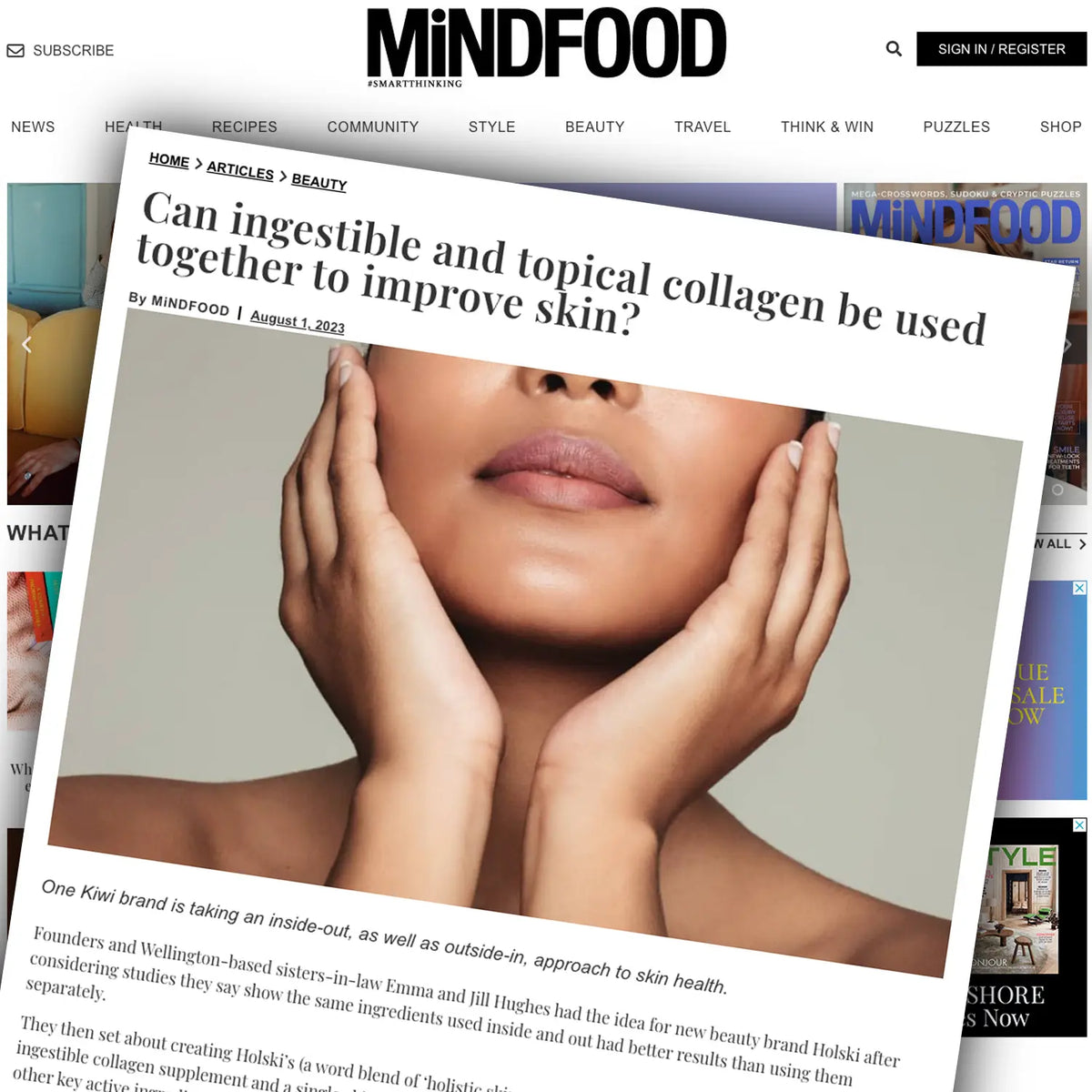Double-Duty Beauty: As we age, collagen levels in our skin diminish, which can leave it not quite as bouncy and firm as it once was. Enter New Zealand brand Holski, which marries supplements (ingestible collagen) with cosmetics
