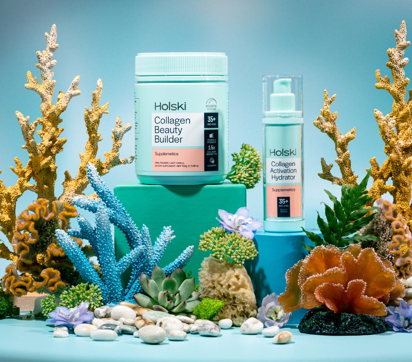 The ingredients in our Holski products come from sustainable sources. The marine collagen we use is a fisheries byproduct and is MSC approved. Ingredients that risk natural habitats such as palm oil are not used. Our packaging incorporates plant-based plastics. These come from sugarcane sourced from renewable resources, and the production process actually reduces greenhouse gas emissions.
